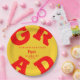 GRAD in bold red lettering curves around the edges of these yellow graduation party paper plates - available in 2 sizes. Congratulations above the name of your graduate and the Class of below. The perfect addition to your table decor for upcoming grad parties. **TIP: Click on CUSTOMIZE button; click on COLOR box on top right; enter your colour hex code in the #xxxxxx box to match your school colours. SEE ENTIRE COLLECTION of pre-done colour combinations and more in our store.