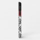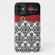 Personalised modern red, black, and white damask Case-Mate Barely There™ iPhone 11 Case with PRINTED ribbon and jewelled brooch.