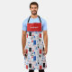 Personalised apron designed with a pattern in red, blue, and black with light bulbs, outlets and plugs, and other electrical symbols, and personalised with your name in white on red at the top. This personalised red electrical electrician apron is perfect for the electrician in your home or anyone who loves electrical work and electricity themed gifts.