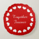 Personalised red round heart pillow for newly weds. Romantic love design with name of bride and groom or husband and wife couple. Cute wedding or valentines day gift idea for newlyweds. Custom message on the back side like Together forever. Customisable red and white colours.