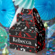 Perfect gift for the music lover or musician with a design featuring a random jumbled pattern of musical notes and treble clefs in red and white on a classical black background. Easy to customise with your own text on a coordinating accent.