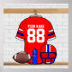 Customisable red white and blue football grid iron jersey sports design. Add the name and number (or age) of the football fan, grid iron player or football coach to create a unique customisable gift. The football jersey is hanging in the sports locker room with a football, water bottle and helmet.
