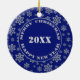 This ornament has a border of silver faux glitter snowflakes on dark blue. The centre has a faux glitter reindeer image and text that says Merry Christmas and Happy New Year. The back of the ornament has the same snowflake on blue border and centre, but in place of the reindeer is your custom text. *Please note - the image is printed and contains no actual glitter.*