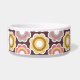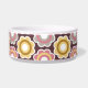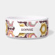 This ceramic dog food bowl has some vintage / retro flowers that are gold, pink, purple, and white in the background. In the middle, there is a large white bone with an easily customised name of your doggie written in purple.