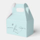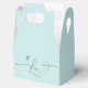 Bring your romance to the table with this love calligraphy favour box. Simple elements of your own romantic photo, island paradise blue, and calligraphy lettering "Love". Personalise the names and date, use your own photo for the circle portrait at the back.