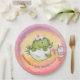 Serve up sweet treats or savory snacks in "roar-some" style with these delightful personalised round paper plates! Each sturdy plate features a charming watercolor illustration of our hatching baby dinosaur wearing a cute pink bow, accompanied by an adorable little duckling. The whimsical design is set against a vibrant pink and yellow watercolor background, customised with the honoree's name and baby shower date. Perfect for hassle-free cleanup, these disposable plates are an essential and coordinating part of your "Girl Can Roar Too" baby shower theme or any special celebration!