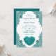 Complement your teal wedding party with these elegant personalised rustic teal wedding invitations featuring a hydrangea heart on a plain white background adorned with teal floral lace. Easily personalise these teal wedding cards with your wedding details. For matching items, please contact us via Zazzle chat.