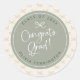 Versatile personalised graduation stickers that can be used for party favours or as envelope seals. Shown in a palette of sage green, dark green, and white, atop a background of a golden bow pattern. (Though all colours are editable by you.) Personalise the template with a graduation year and name. © Kimbellished, LLC