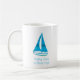This mug features a bright watercolor blue sailboat on a white background. The sailboat has script beneath it that says "Sailing away to better days." The message can be personalised by changing the message in the template box.