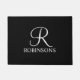 features personalised family name in white classic serif font style and monogram in white classic script font style on black background.