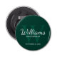 This bottle opener features personalised groomsman's name in white classic script font style with wedding details in white classic serif font style and monogram in light emerald green classic serif font style as background, on emerald green background.