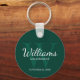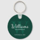 This keychain features personalised groomsman's name in white classic script font style with wedding details in white classic serif font style and monogram in light emerald green classic serif font style as background, on emerald green background.