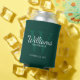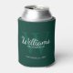 This can cooler features personalised groomsman's name in white classic script font style with wedding details in white classic serif font style and monogram in light emerald green classic serif font style as background, on emerald green background.