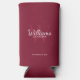 This can cooler features personalised groomsman's name in white classic script font style with wedding details in white classic serif font style and monogram in light burgundy red classic serif font style as background, on burgundy red background.