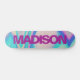 Easily personalise this colourful Skateboard Custom Name Retro 90 Vaporwave abstract design featuring blue, pink and yellow rainbow shades and purple violet and cool sans serif font. Add your name, choose font, change size and position, add clipart, photos and shapes. Simple and beautiful, perfect as kids gift idea.