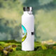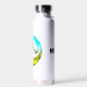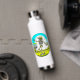Blue and green personalised water bottle with a vintage retro vibe featuring a skeleton in a sunhat disc golfing in the woods.