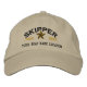 A personalised nautical star skipper embroidery design on a fine casual embroidered baseball cap. A one of a kind fashion statement sure to make an impression on, or off the boat.