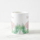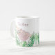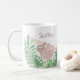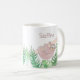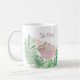 This cute mug is decorated with a watercolor of a smiling sloth hanging from a branch with tropical leaves and the word Sloffee.