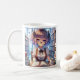 Add name in personalised area. Anime Girl with purple eyes in Glasses at the Library reading books in a cute dress with cat ears headphones.