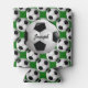 A football soccer ball design which is fully customisable with your own name or text. The background features a pattern of soccer balls on a football pitch green. Ideal for any soccer player, football coach or soccer fan.