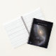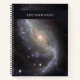 Personalised spiral notebook features image of a spiral galaxy, nebula, and stars. Customised text or name is at the upper part in the same colour as the centre of the galaxy on dark grey wide stripe.