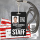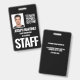 This simple and professional design features a black background. The template is easily customisable, just staff name, job title, employee ID. The bottom edge has a QR code that can be changed to any desired title. The back has your contact information and instructions for returning if found. This classic design works well for any type of event.