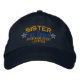 An all star Personalised Sister of the Groom Embroidery in gold and blue on a custom baseball cap. A perfect last minute gift idea. Personalise this custom embroidered hat with your name or text using the editable text field on this product page. A personalised wedding party sure to make an impression on or off the aisle.