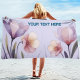 Wrap yourself in style with this beautiful watercolor floral beach towel. Featuring delicate purple and peach blossoms on a soft lavender background, this towel offers a serene and elegant look. Personalise it with "YOUR TEXT HERE" to make it uniquely yours or create a thoughtful gift. Perfect for beach days, pool sides, picnics, or simply adding a touch of nature-inspired beauty to your home. Made from soft, absorbent material for ultimate comfort and quick drying.