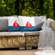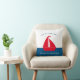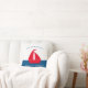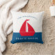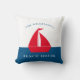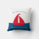 Stunning nautical red white and blue throw pillow featuring a red boat on a white and blue colorblock background , with a two text templates where you can add your family name and boat house , summer home or even cottage , very easy to personalise and make it your own.