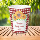 These floral family reunion paper cups will look great on your party table. They are decorated with watercolor sunflowers and foliage on a red gingham background.