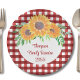 These floral family reunion paper plates will look great on your party table. They are decorated with watercolor sunflowers and foliage on a red check background.