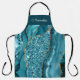 Personalised teal blue Agate print apron with name in script lettering. Chic blue sequence style and marble geode pattern.