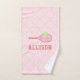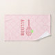 Coral Pink and Lime Green Personalised Girl's and Women's Name, Monogram Tennis Design sports towel with a bold and sporty custom text with tennis racket and ball icon on a faded net background pattern.