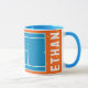 Creative tennis player gift mug featuring tennis balls on blue and orange tennis court. To personalise edit text to add his or her name.