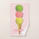 Creative tennis towel featuring colourful tennis balls as ice cream scoops on pink background. To personalise edit text to add name.