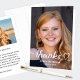 Graduation thank you card features a portrait photo of the graduate with simple "Thanks" heart script design and custom text overlay in white that can be personalised with the grad's name and class year. The inside of the card includes a horizontal photo with custom thank you message.