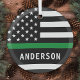 Thin Green Line Flag Military Ornament, a perfect addition to your Christmas decor! Show your support for the brave men and women who protect our borders, parks, and wildlife. This modern and simple ornament features the American flag with a thin green line representing federal law enforcement officers, border patrol, game wardens, park rangers, conservation officers, army, navy, and marines.