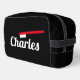 Personalised toiletry bag with red toothbrush logo. Custom travel Dopp kit design with script typography.