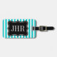Personalised travel luggage tag | elegant style. Classy turquoise blue stripe design with white monogrammed name intitial letters. Elegant gift idea for men and women. Cute 3 letter monogram with striped pattern. Customisable background colour.