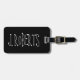 Personalised travel luggage tag with funny letters. Simple black and white design with white monogrammed name intitial letters or full name. Cute gift idea for men and women