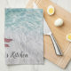 This beautiful personalised tropical beach kitchen towel features a photograph of a flamingo on a white sandy beach with turquoise sea and her own name alongside "Kitchen". Easy to customise with your own name in trendy hand lettered script calligraphy. This cool design is perfect for the girly girl who loves the beach and pink flamingos, and is great for a beach house or beach vacation home. Photograph of the beach and flamingo © by T.K Goforth, and signed by the artist, all rights reserved.