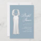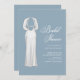 Celebrate the bride-to-be with a personalised dusty blue bridal shower invitation. This elegant invitation features a script "bridal shower" phrase, a white wedding dress clipart element, the bride's name and bridal shower details, all on a dusty blue background.