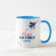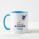 This US Proud Air Force Wife mug features a jet with american flag and custom name.
