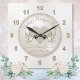 Personalised Wedding Clock. Love Birds Wedding Gifts. Type in Your Wedding Message (or Anniversary), Couple's Names, Wedding Date or YOUR TEXT or Delete. Beautiful ivory and taupe colours satin pearl look background with Love Doves coming together on a Heart Wedding Clock. Neutral tones for any room. Wonderful and memorable gifts for Newlyweds and Personalised Bridal Shower Gifts for couples.