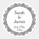 Add a special touch to your wedding favours or envelopes with these personalised round stickers. The stickers feature an intricate ornamental frame with repeating heart symbols, surrounding your custom names and wedding date. The design is elegant and timeless, adding a touch of romance to your special day. These stickers are perfect for sealing envelopes, decorating favours, or as a fun addition to your wedding décor. Order now and make your wedding day even more memorable!