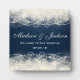 A personalised plaque which reads: welcome to our wedding. Customise with the bride and grooms name and wedding date. The background borders are a fancy and elegant design with cream coloured lace and pearls made with circles and bubbles. The centre is dark blue with faded squares off to the side. Pretty and delicate design.