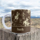 This dark brown personalised Western themed mug has a variety of rodeo cowboys in action riding, roping, and bronc busting, interspersed with saddles, boots, and hats, on a vintage background.