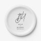 Add a touch of elegance to your wedding reception with these personalised paper plates. Featuring a large brushed script two initial monogram with the couple's name and wedding date below in modern sans serif font, this design is perfect for a sophisticated and stylish celebration. The white text on a black background creates a timeless and classic look that will coordinate perfectly with your wedding decor.