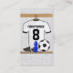 Personalised white and black football soccer jersey shirt, hanging in a sports locker room with a water bottle, football cleats and a soccer ball. Just add the name and number (or age) of the soccer player, football fan or soccer team coach to create a unique soccer gift.