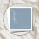 Add a touch of timeless elegance to your wedding reception with these personalised white "Cheers!" dusty blue wedding napkins.